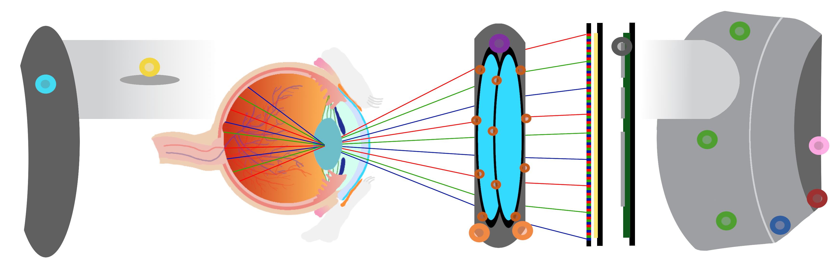 Components of an HMD. Cameras for see-through applications (red) and microphones (pink) are often mounted on the front of the enclosure (right). In addition, there are cameras on the bottom for hand and controller tracking (blue). Some models also have infrared LEDs for external tracking (green). Inside the headset are the main circuit board, an IMU sensor for tracking head orientation (grey), a display and two lenses. Depending on the design, the display may have a backlight (as shown here) or not. A light sensor (purple) is often attached to the optical module to determine whether the HMD is currently in use. In addition, many models have two eye tracking cameras (orange) and infrared light-emitting diodes (brown) distributed around the lens, which emit infrared light towards the eyes which cause reflections necessary for eye tracking. The head strap at the back of the HMD (left) often contains headphones (yellow) and batteries (cyan) and allows the display to be worn securely on the head.