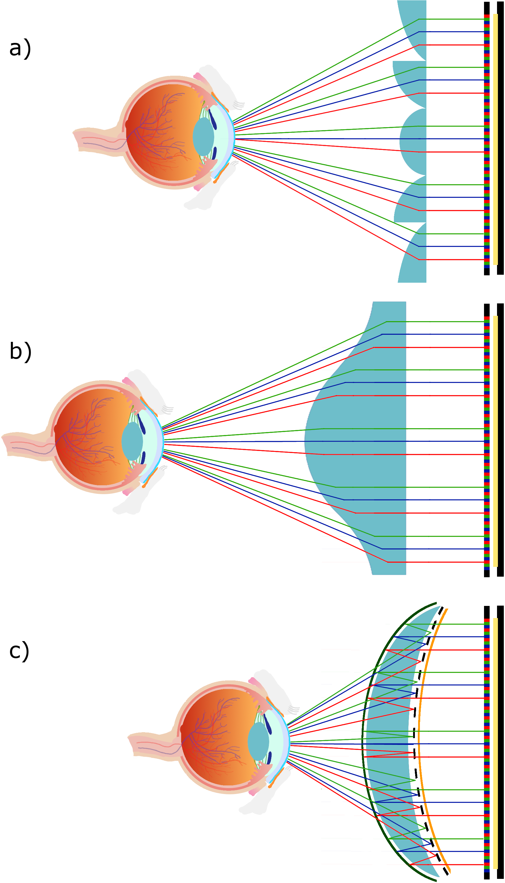 Fresnel lenses consist of many prism-like, ring-shaped sections. With each section and from the inside to the outside, the angle at which the emerging light is diffracted increases (A. Davis and Kühnlenz 2007). Fresnel lenses can be made of plastic and are therefore comparatively light. However, with the designs currently in use, the edges of each lens section are clearly visible. In addition, a sharp image can only be seen when the user’s eyes are directly opposite the flat surface in the centre of the lens. This makes the area through which an image can be perceived sharply (sweet spot) comparably small. Moreover, light, especially from outer parts of the lens, can stray into other, darker areas of the image (Haitao et al. 2022). Sometimes the resulting visual effect is referred to as a ghost image. Additionally, Fresnel lenses introduce distortion to the transmitted image, accompanied by chromatic aberrations, often resulting in blurring and colourful aberrations on high-contrast edges. To present an undistorted image, the displayed content is preprocessed by software (Anthes et al. 2016; Nikonorov et al. 2015).
